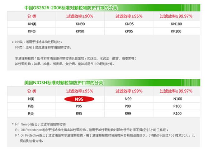我們既然看到有N95,是不是還有其他型號(hào)呢?上面也整理到N95是較低的標(biāo)準(zhǔn),肯定還有較高的標(biāo)準(zhǔn)。NIOSH認(rèn)證的其他防顆粒物口罩級(jí)別還包括:N95、N99、N100、R95、R99、R100、P95、P99、P100,一共有9種。N,表示不耐油(not resistant to oil),適合非油性顆粒物;R,表示耐油(resistant to oil),適合油性或非油性顆粒物,若用于油性顆粒物的防護(hù),使用時(shí)間不超過8小時(shí)。P,表示防油(oil proof),適合油性或非油性顆粒物,若用于油性顆粒物,使用時(shí)間應(yīng)遵循制造商的建議。后面的數(shù)字則表示防護(hù)過濾能力。99表示過濾效率在99%以上,100表示過濾效率在99.7%以上。