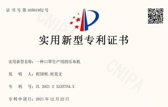 近日,由安徽國(guó)林醫(yī)療科技有限公司申報(bào)的實(shí)用新型“一種口罩生產(chǎn)用的壓布機(jī)”正式獲得國(guó)家知識(shí)產(chǎn)權(quán)局下發(fā)專利證書。...